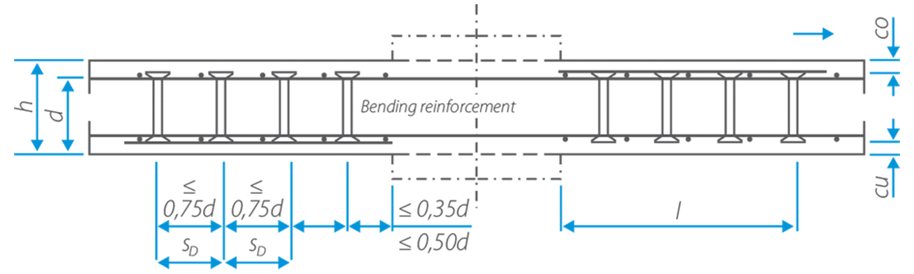 - The studs of the first row are placed at a distance from the column face between 0.35d and 0.5d.